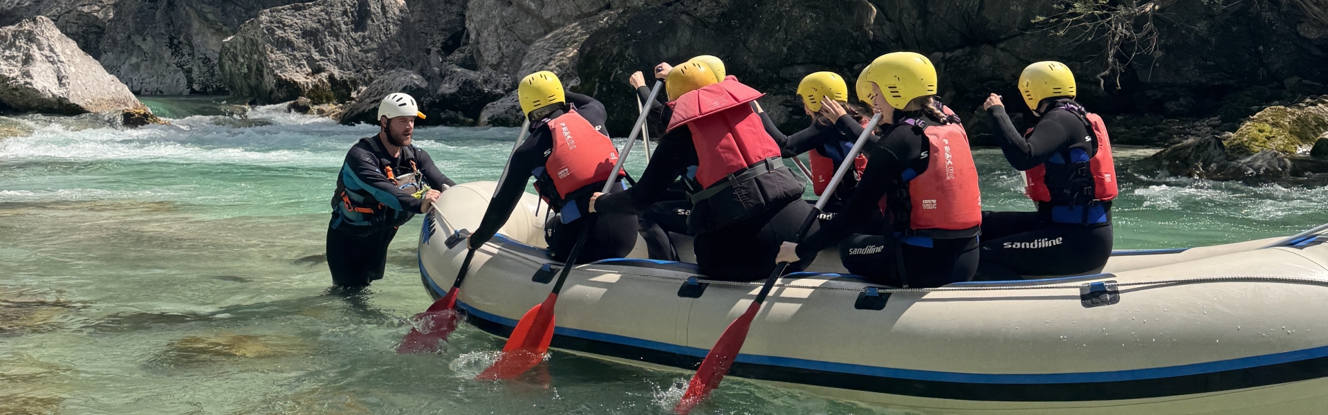 Preden se odpravimo na reko Sočo nas bodo vodiči podučili o varnosti na reki, predstavili potek spusta ter pokazali kako pravilno veslati.